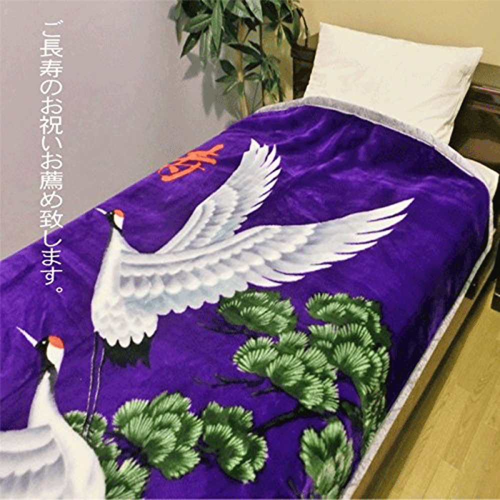 鶴の柄 開運招福毛布寿(合せ) 紫 贈答用箱入り